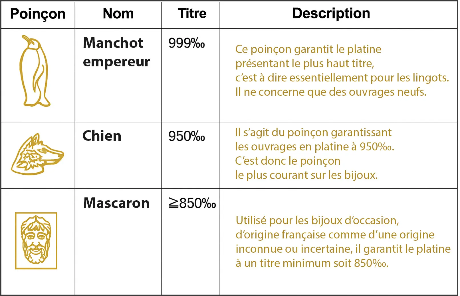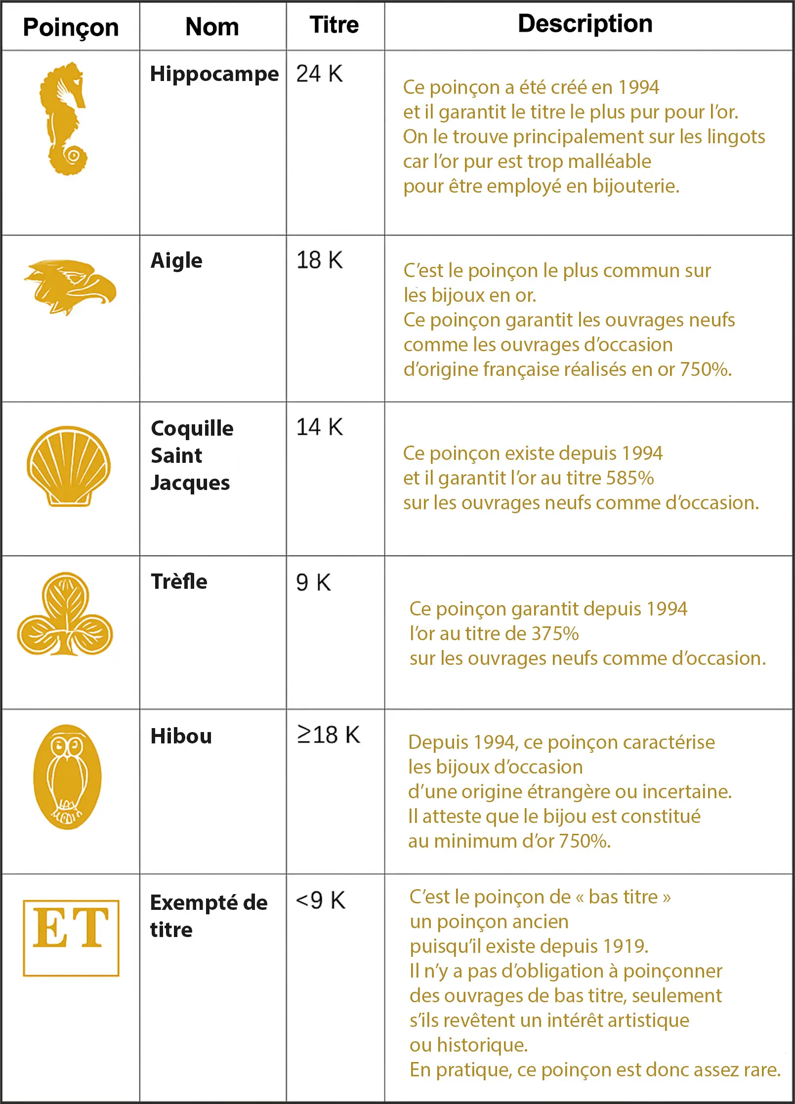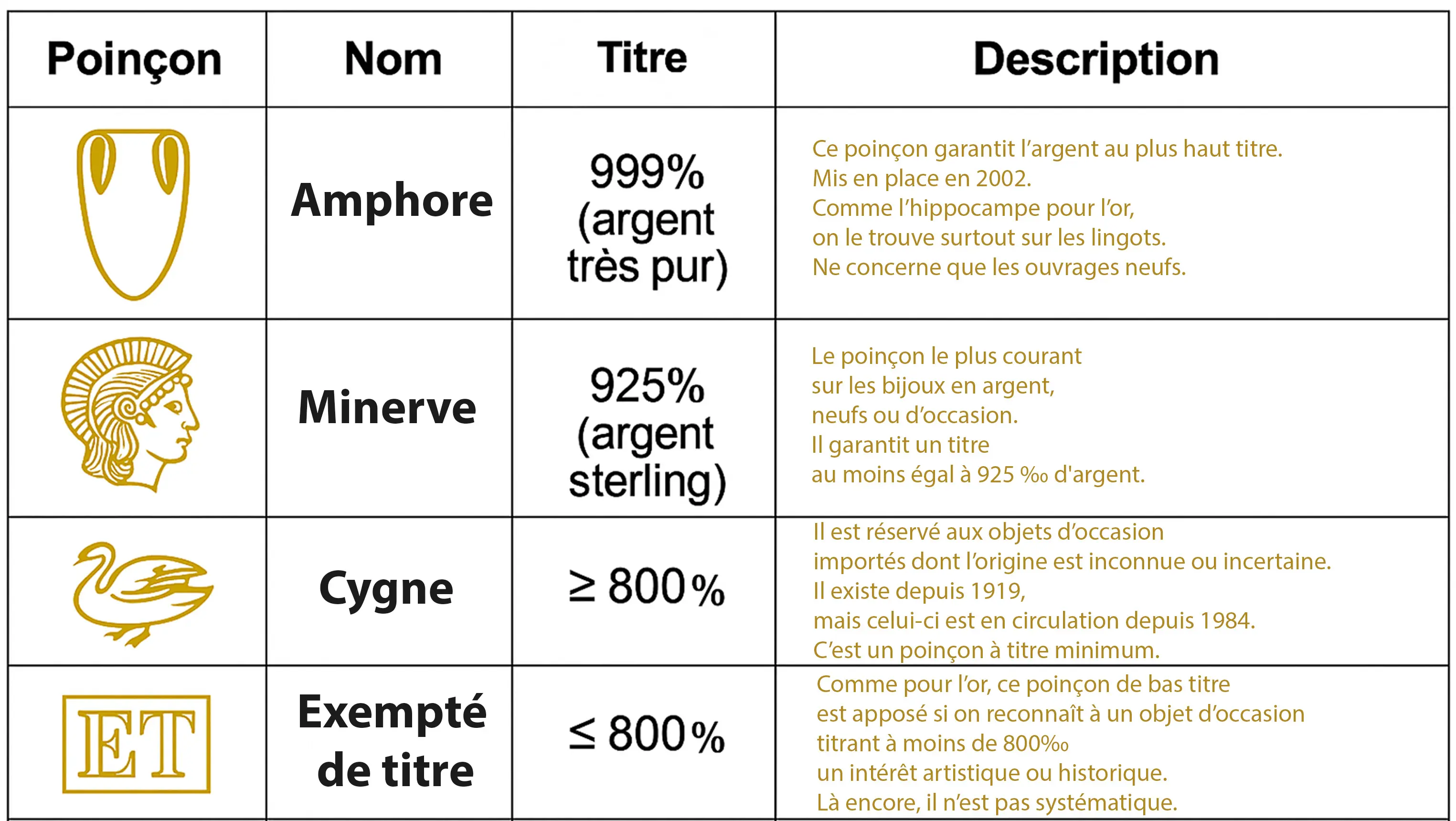 - Validité : À vie, le poinçon ne s'efface jamais légalement